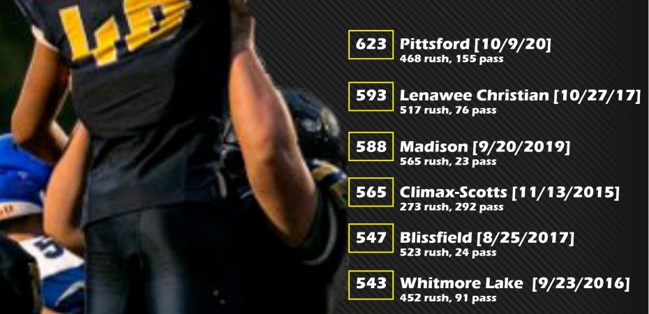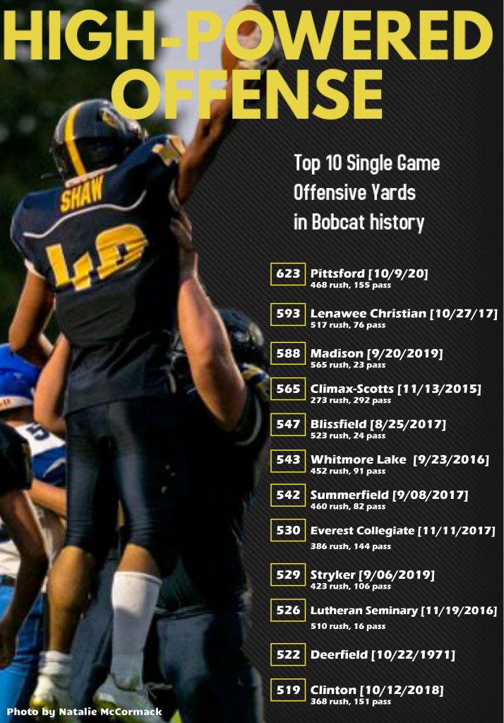 Whiteford’s offensive wizardry topped the 593 yards the Bobcats put up against Lenawee Christian in a 2017 playoff game and the 588 yards Whiteford had last season against Madison. School records date back into the 1950s, and although not every game is available, Friday’s output topped every offensive output on record. Whiteford set another record with 32 first downs.