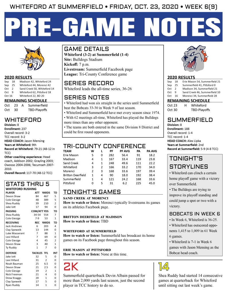 Whiteford enters tonight’s game solidly in the No. 3 spot among the eight teams in the Division 8, Region 4, District 1 ineup. Summerfield sits in the No. 6 spot. If the playoffs began this week, Whiteford and Summerfield would be facing off as the No. 3 seed hosts the No. 6 seed in the first round.