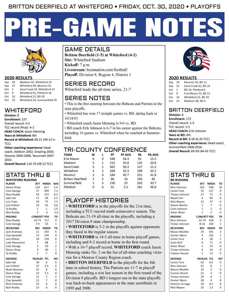 OTTAWA LAKE — The Whiteford Bobcats will take on the Britton Deerfield Patriots tonight in the opening round of the state playoffs.