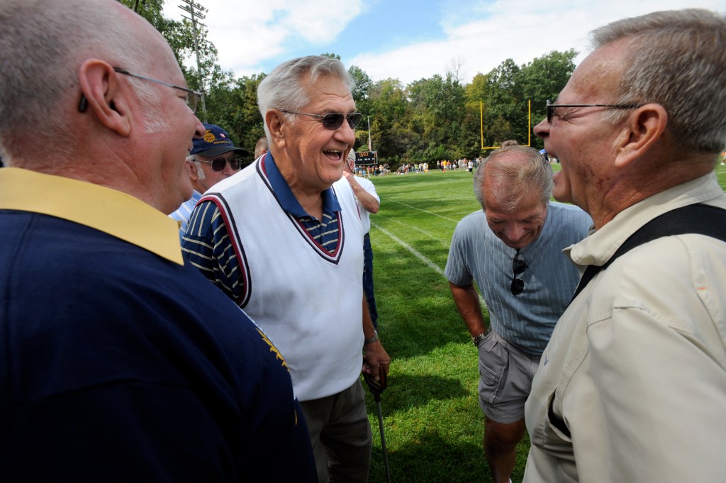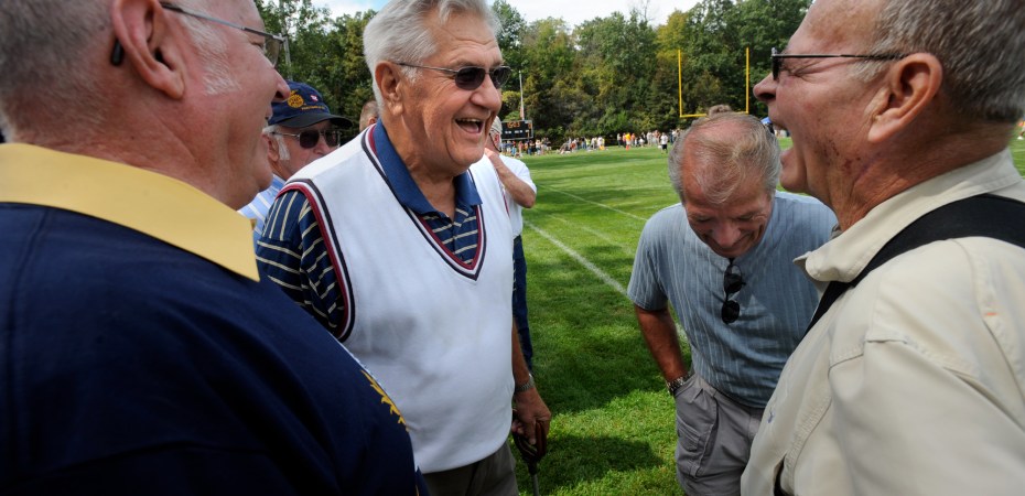 Gene Perry (from left), Jim Gasiorowski of Lambertville, Pat Iott and brother Bob Iott share stories and a laugh before the start of a 2008 Whiteford homecoming football game. The four were part the school’s first football team when Mr. Gasiorowski was the head coach. Whiteford Agricultural Schools celebrated the 50th anniversary of its first graduating class Saturday that day. Coach “Gaz” died January 25.