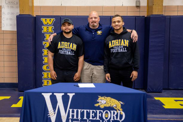 Photo by Natalie McCormack. D’Ondre Shaw (left), Coach Jason Mensing and Devon Shaw of Whiteford at a signing ceremony last week for Devon, who is going to play college football at Adrian College.