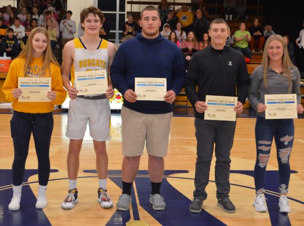 Graduate Paige Thomas was joined by seniors Berlynn Keller, Cole Giesige, Noah Bauman and Levi Hillard at the induction ceremony, held at halftime of the Whiteford-Britton Deerfield boys basketball game. They will be joined next week by senior Ambrelle Billau.