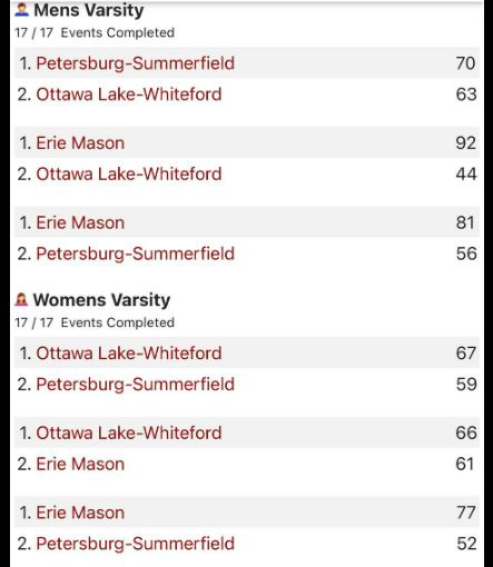 OTTAWA LAKE — Whiteford’s girls track and field team won a pair of TCC dual meets Tuesday, beating both Summerfield (67-59) and Erie Mason (66-61).