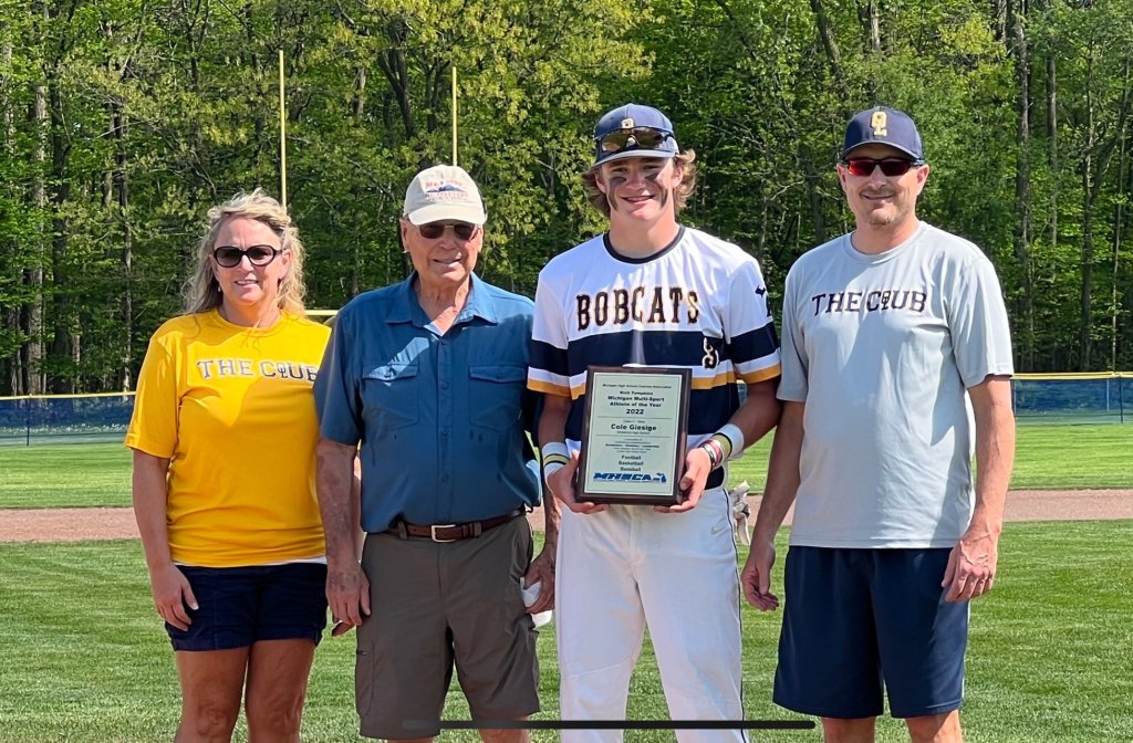 Prior to the game, Whiteford’s Cole Giesige was honored by the Michigan High School Coaches Association with the Class C Rich Tompkins Multi-Sport Athlete Award. He is pictured with his parents, Kim and Troy Giesige, and Larry Merx from the coaches association.