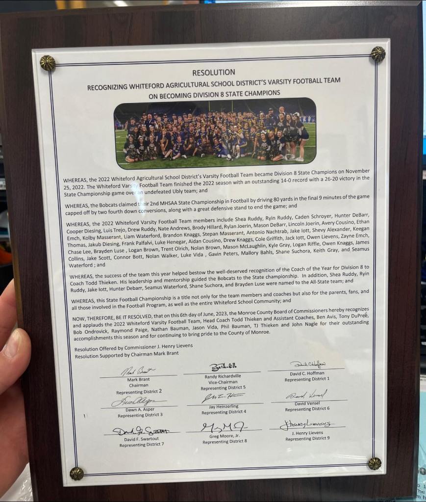 MONROE – Whiteford’s 2022 state championship football team were honored by the Monroe County Board of Commissioners Tuesday.