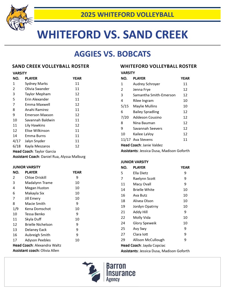 September 16, 2025September 16, 2025 dougdonnelly Whiteford hosts Sand Creek in TCC volleyball action tonight OTTAWA LAKE – Whiteford will take on Sand Creek tonight in a TCC volleyball matchup. Here’s the rosters: Share this: Click to share on X (Opens in new window) X Click to share on Facebook (Opens in new window) Facebook Like Loading... Related
