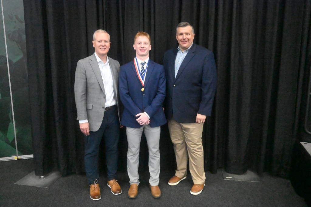 Shown with Ruddy are (from left): Don Simon, chief executive officer for Farm Bureau Insurance; and Mark Uyl, executive director of the MHSAA. Ruddy will receive a $2,000 scholarship from Farm Bureau Insurance to be used at the institution of higher learning he attends this fall. Farm Bureau Insurance awarded 32 scholarships, proportionately by school classification, to students with a 3.50 or higher (on a 4.0 scale) grade point average who have previously lettered in at least one sport in which postseason competition is sponsored by the MHSAA.
